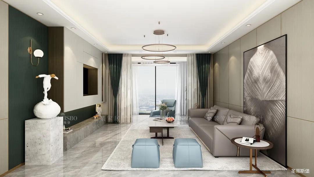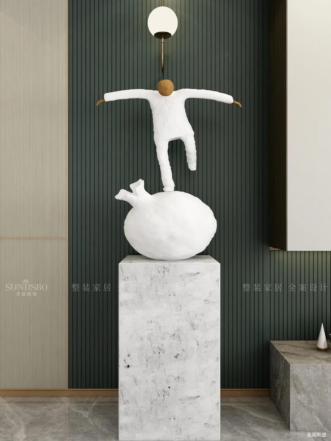 白绿搭配作为当下时尚界的黑马,一个沉着冷静,一个高级清新,相互碰撞出前所未有的视觉享受。纯白异型艺术雕塑是室内和谐的体现,也让空间洋溢着趣味性。