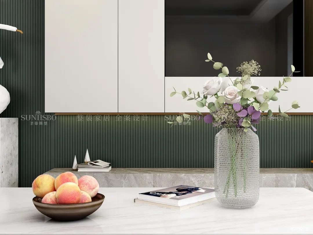 餐厅全开放式的布局,遵循了家具收纳的28原则,20%的封闭式储纳,收纳不常用的杂乱物品,80%的半开放设计,展示软装饰物。餐边柜将玻璃、金属、实木材质糅合分配,让空间质感倍增的同时,也让用餐空间多了一份家的温度。