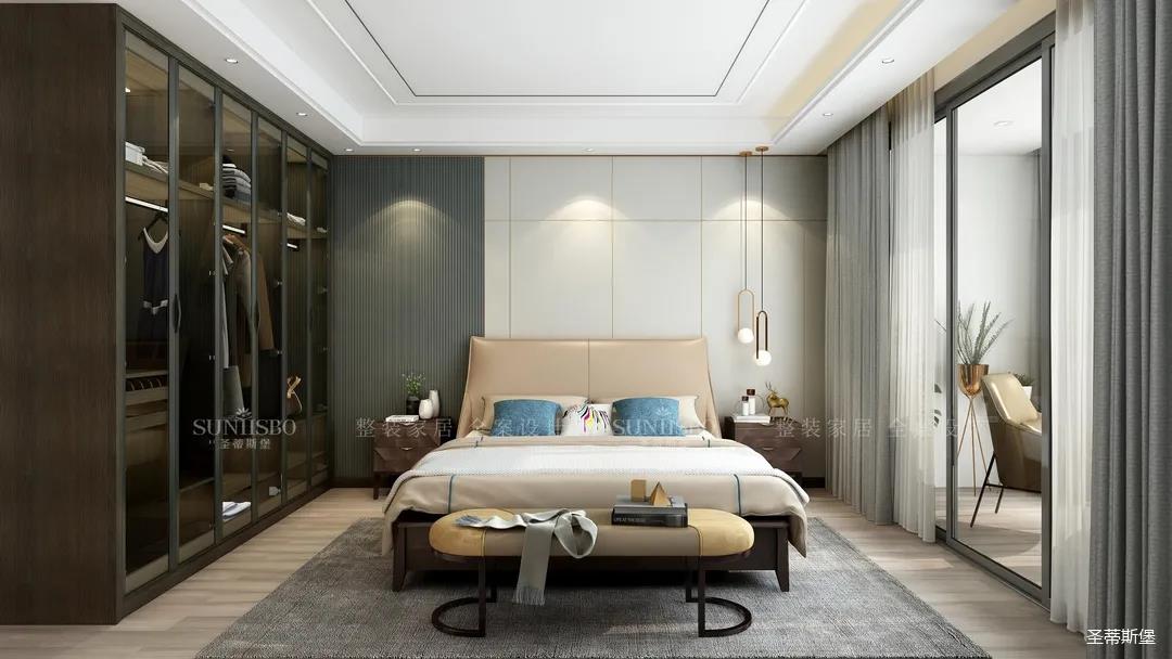 主卧运用了大面积落地窗围合,整体的无主灯设计,凸显了空间极简潮流。无限引入窗外的移动光线,轻松为空间注入阳光的温度,u型极简金属悬置着一个白色造型灯,让空间从静谧中生出无穷的变幻。家具设计偏向简约舒适,造型虽不夺目,但细节质感却能经得起时光的琢磨与品味。