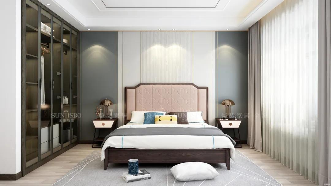 次卧床头是现代感十足的格栅设计,简约精致又颇具深度朦胧感。竖条纹的格栅还能起到拉伸视觉的作用,主观上提高了空间的开阔感。定制衣柜则根据空间整体的简约调性,将开放式与隐蔽收纳五五分,散发出高贵沉稳的优雅气质,和生活品味形成了恰到好处的平衡。